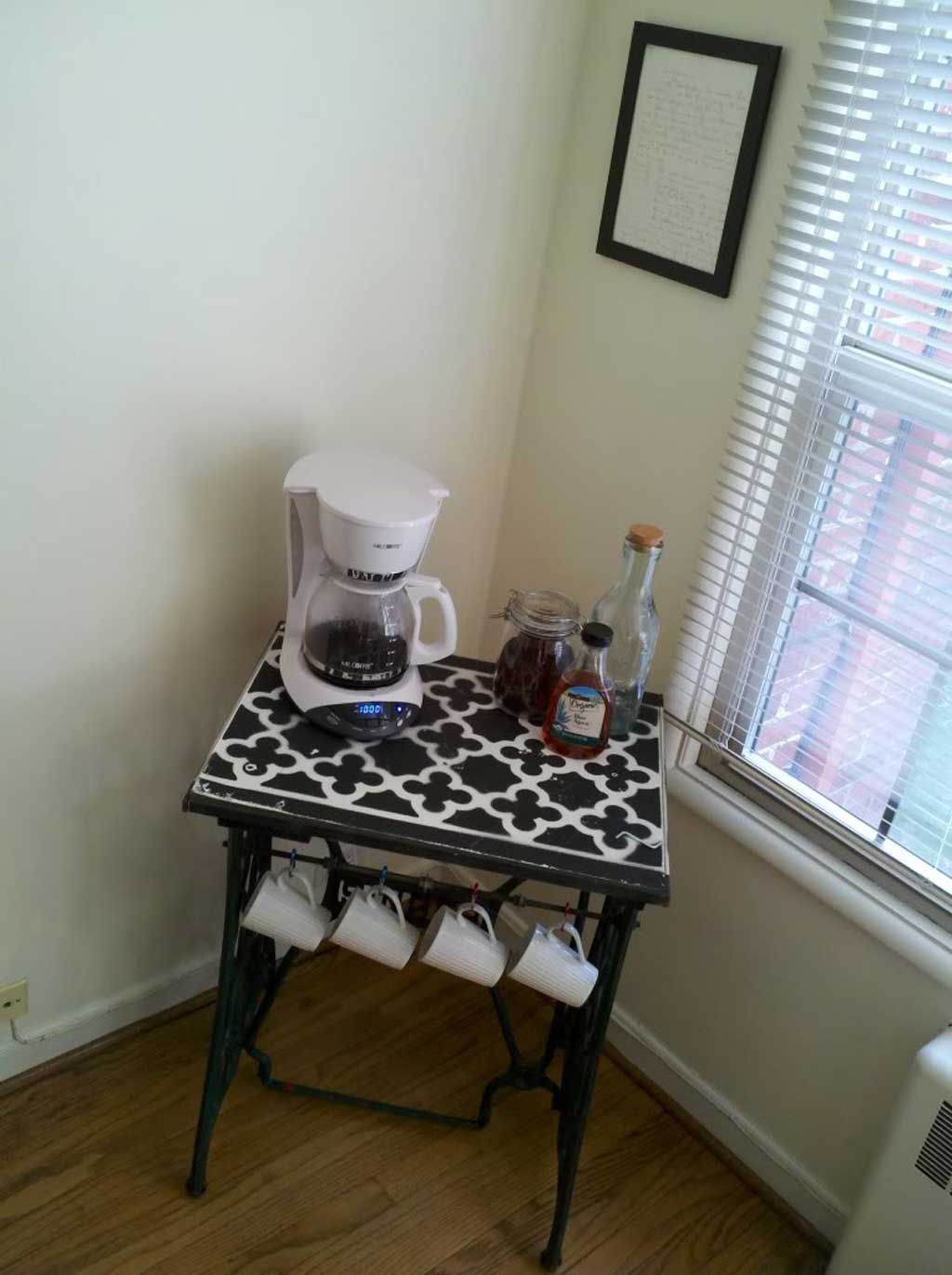 Turn your sewing machine into this stunning and functional coffee station. Just add beautiful wooden or marble top to give it a finished look and storage drawers underneath to keep your cups and accessories and that’s it.