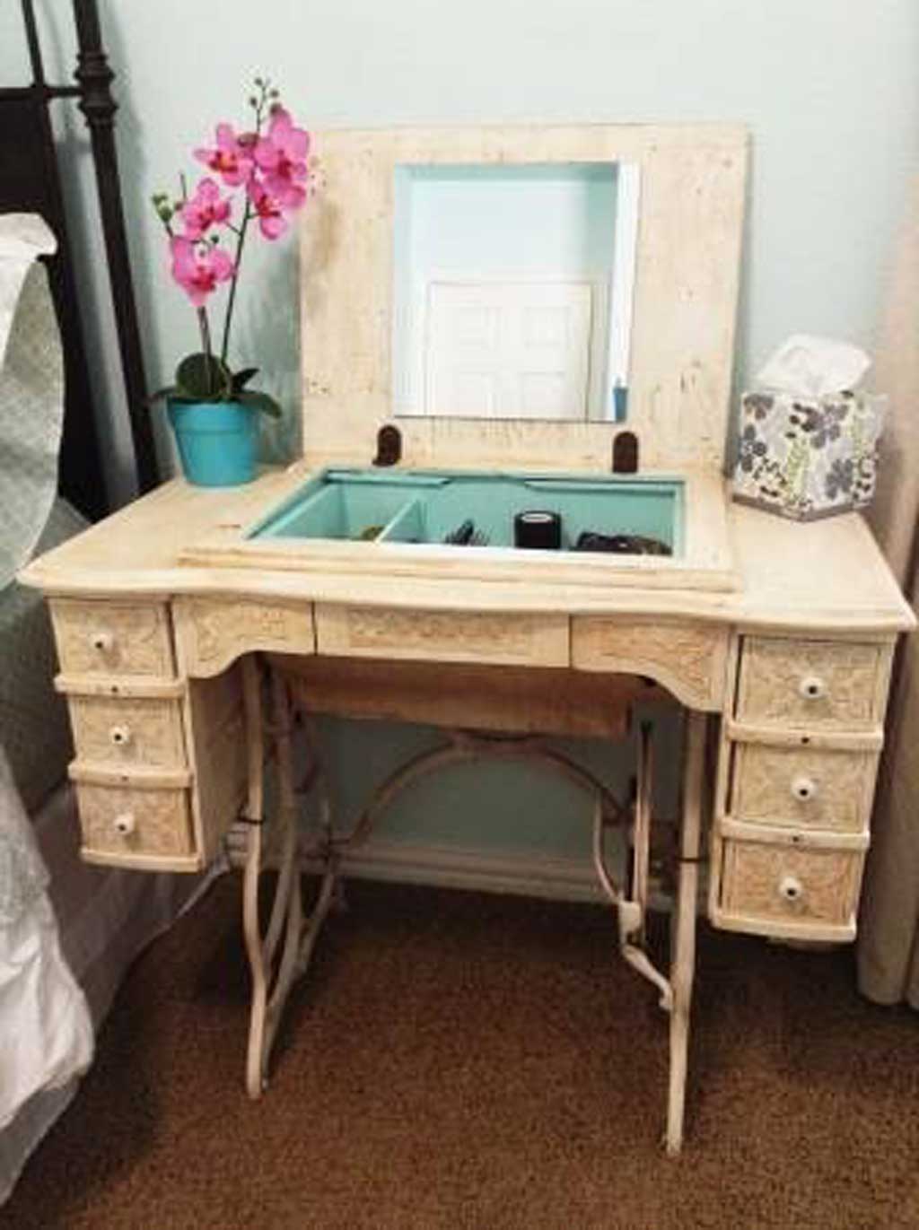 Convert your old sewing machine into a vintage dressing table just by adding few drawers on both sides and mirror at the center.