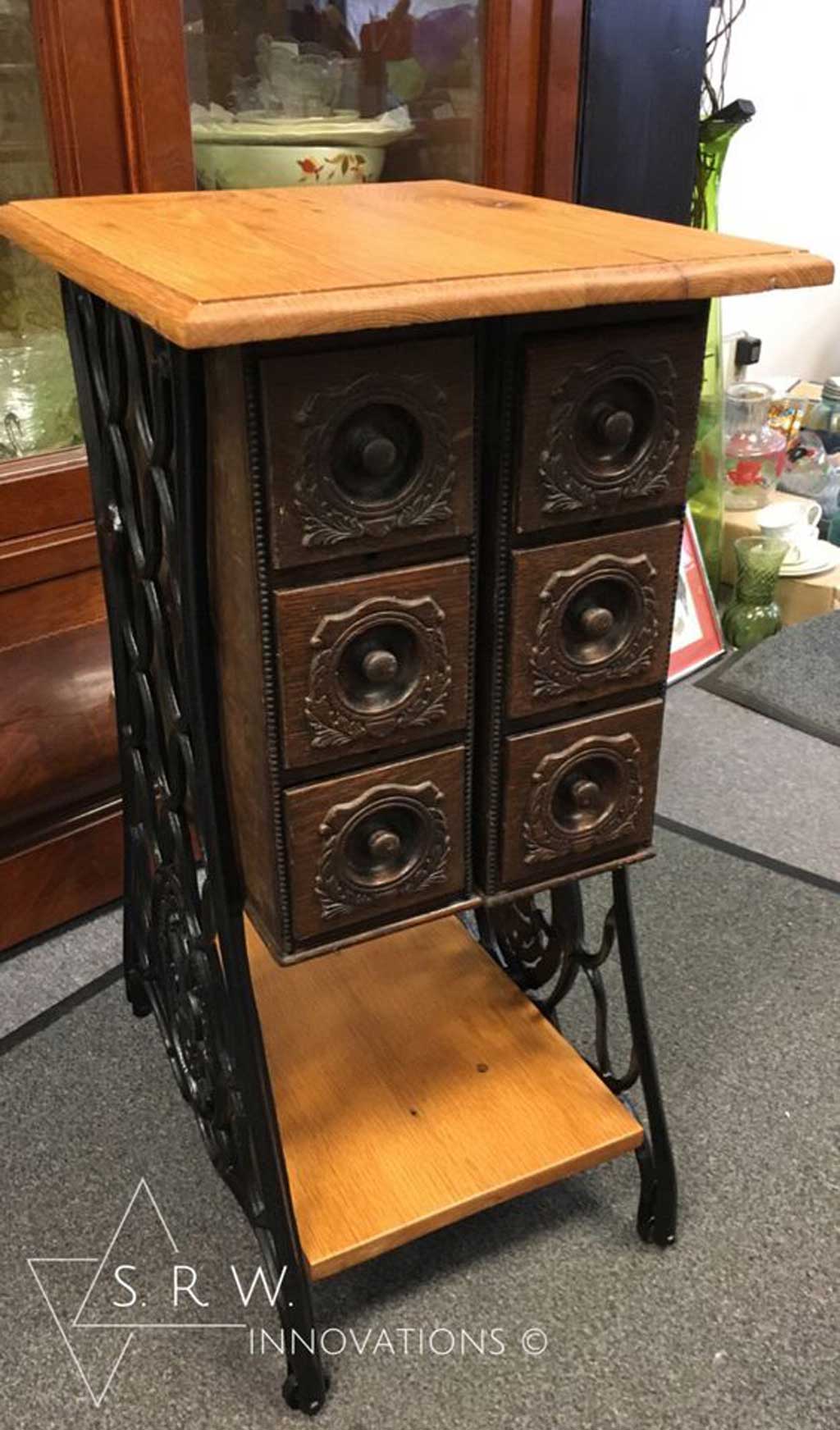 I think smaller drawers would be a better fit for creating storage into to sewing machine. Finish them as per your taste and then use it as side table cum storage closet. You could turn it into multi-functional table just by adding a standing mirror on the storage top.